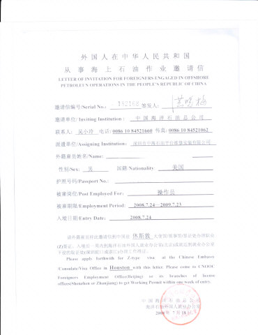 - An Official Letter of Invite - (Link to sample) from a qualified issuing agency or the Ministry of Foreign Affairs with a seal from the Ministry of Foreign Affairs. The invitation must have the fax number of the inviter. The letter of invitation must have the personal information from the invitee-name, gender, date of birth etc. The letter must have information concerning the invitees visit to China-purpose of visit, date of arrival and departure, places to be visited, relationship between the applicant and inviter in addition to the applicants accommodations and who will be responsible for the cost of the accommodations while the applicant is in China.